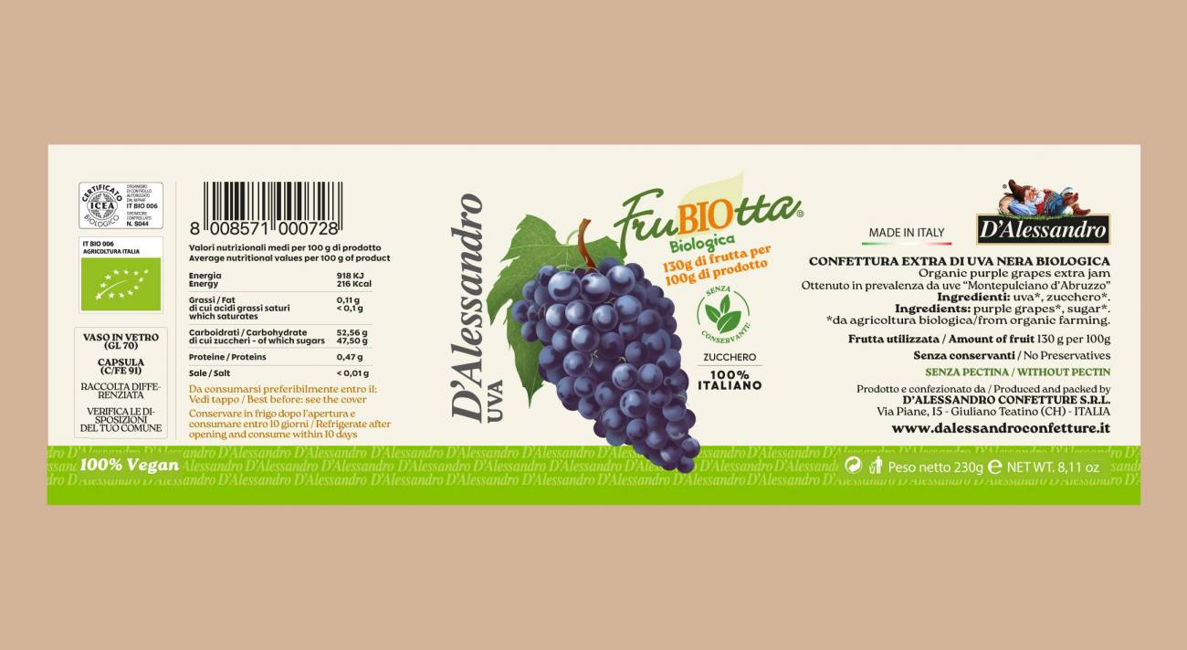 La confettura extra di uva biologica è preparata solo con uva bio locale raccolta e lavorata al giusto grado di maturazione e zucchero grezzo certificato biologico.