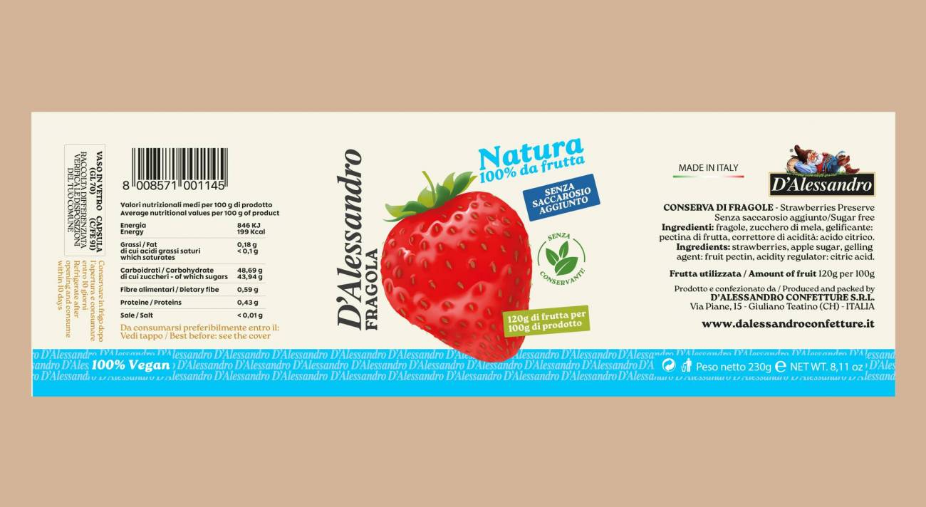 Ingredienti: Fragole, zucchero di mela, gelificante: pectina di frutta, correttore di acidità: acido citrico.