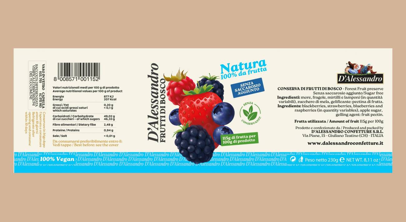 Il gusto semplice e inconfondibile dei frutti di bosco raccolti al giusto grado di maturazione rende questa confettura una delle preferite da grandi e piccini.